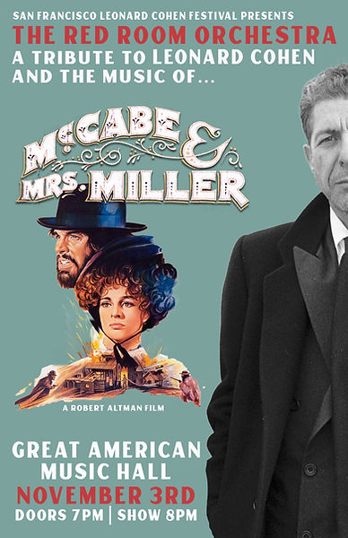 The Red Room Orchestra presents an evening of music from Robert Altman’s McCabe & Mrs. Miller, plus other Leonard Cohen cinematic classics, featuring Tom Ayres, Marc Capelle, Karina Denike, Petra Haden, Jess Ivry, Dina Maccabee, Genarro Pocaro, and Pete Straus.