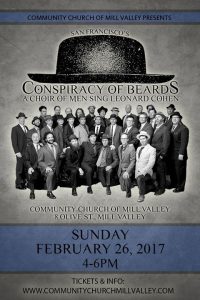 Find out more »Conspiracy of Beards is a 30-member male choir that performs dynamic, original, a cappella arrangements of the poetic songs of Leonard Cohen. Please join us for an early evening of music at the Community Church of Mill Valley from 4-6pm. Tickets: http://www.brownpapertickets.com/event/2830916