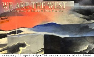 Find out more »Dear friends, Join us Saturday April 16 in the parking garage for an underground concert spectacular. We're pleased to welcome Conspiracy of Beards, a 26 member male choir interpreting the songs of Leonard Cohen, down from the Bay Area, as well as longtime garage-friend Dina Maccabee Music as our very special guests, plus new work by resident artist David A. Soto, all before WE ARE THE WEST takes the stage. This will be one to remember. See you underground! 8p…
